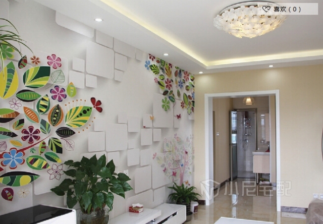 白色為底鑲嵌五彩繽紛的花朵與莖葉,配上綠白相間的窗簾,使整個(gè)空間清新淡雅。電視矮柜擺上綠色植物,與背景花朵相得益彰。