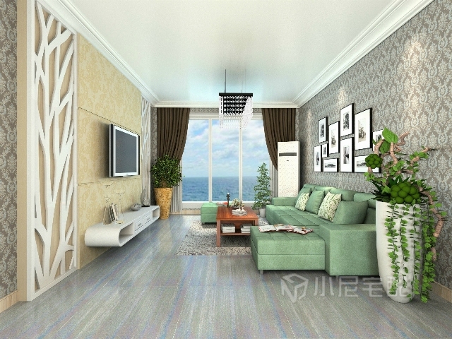 落地窗加淺色的壁紙讓客廳的空間顯得更加寬闊。