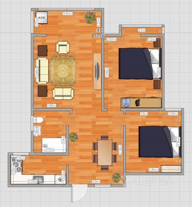 設計師用反射特性和穿透感強的材質,在視覺效果上創造出更大的空間,在兩室兩廳一衛的配置內,讓坪效發揮到極致。