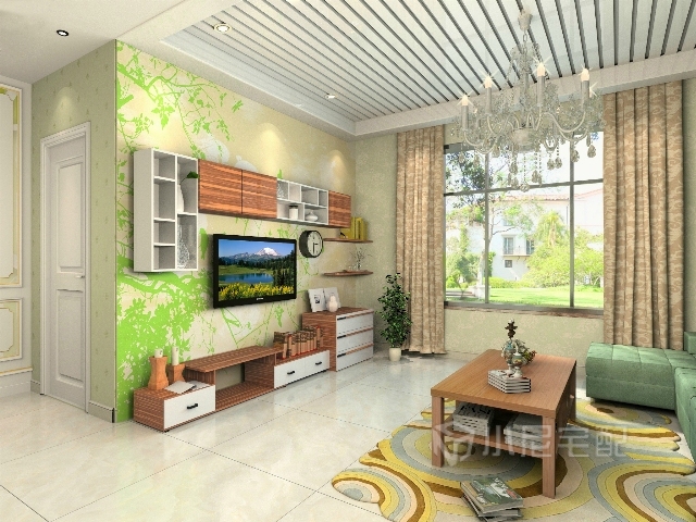 電視背景墻的一抹綠色墻紙給整個不大的空間帶來了生機。