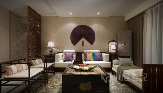客廳的背景墻用扇形做的裝飾,十足的東南亞風。