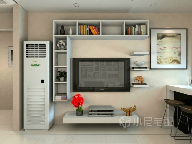 電視墻使用柜子,客廳雖小但儲物空間足夠,格架和板架可放置不同物品,同時避免造型過于單一。