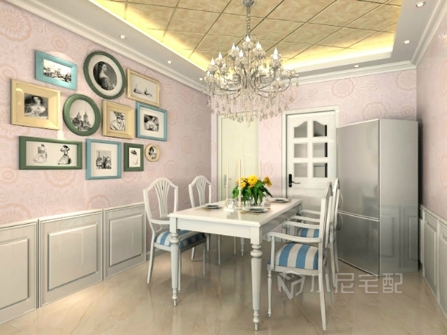 把帶有田園風格的餐桌和簡約而不單調的壁紙采用混搭,使用照片墻裝飾,餐廳不是簡簡單單的吃飯,而是一種溫馨而又暖意。