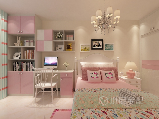 甜美的粉色星空圖案床品,搭配素雅簡潔的白色床單,讓臥室充滿女孩最愛的浪漫氣息。藤編床頭柜的點(diǎn)綴,讓這款房間增添了田園的感